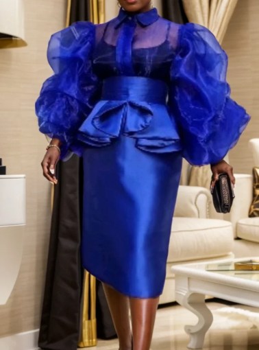 Fashion Party Style Long Sleeved Blue See Through Mesh 2-piece Set for Women’s Spring Office Club Party Birthday Skirt Set